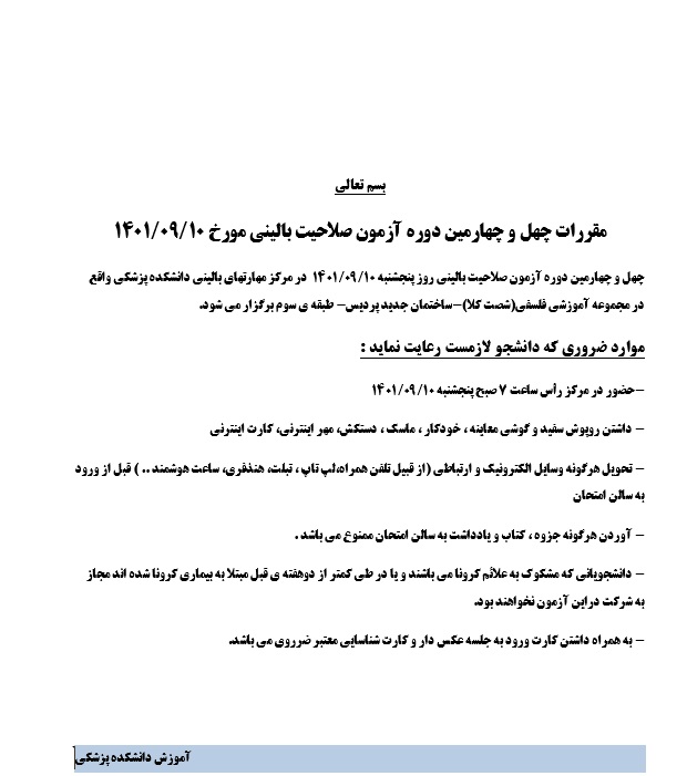 ۱- تاریخ برگزاری آزمون روز چهارشنبه ۲۶/۷/۱۴۰۲ از ساعت ۸:۰۰ صیح به ترتیب و در ۵ گروه متوالی خواهد بود. که از طریق پیامک و همچنین از طریق آموزش دانشکده می توانید از ساعت آزمون خود مطلع شوید.